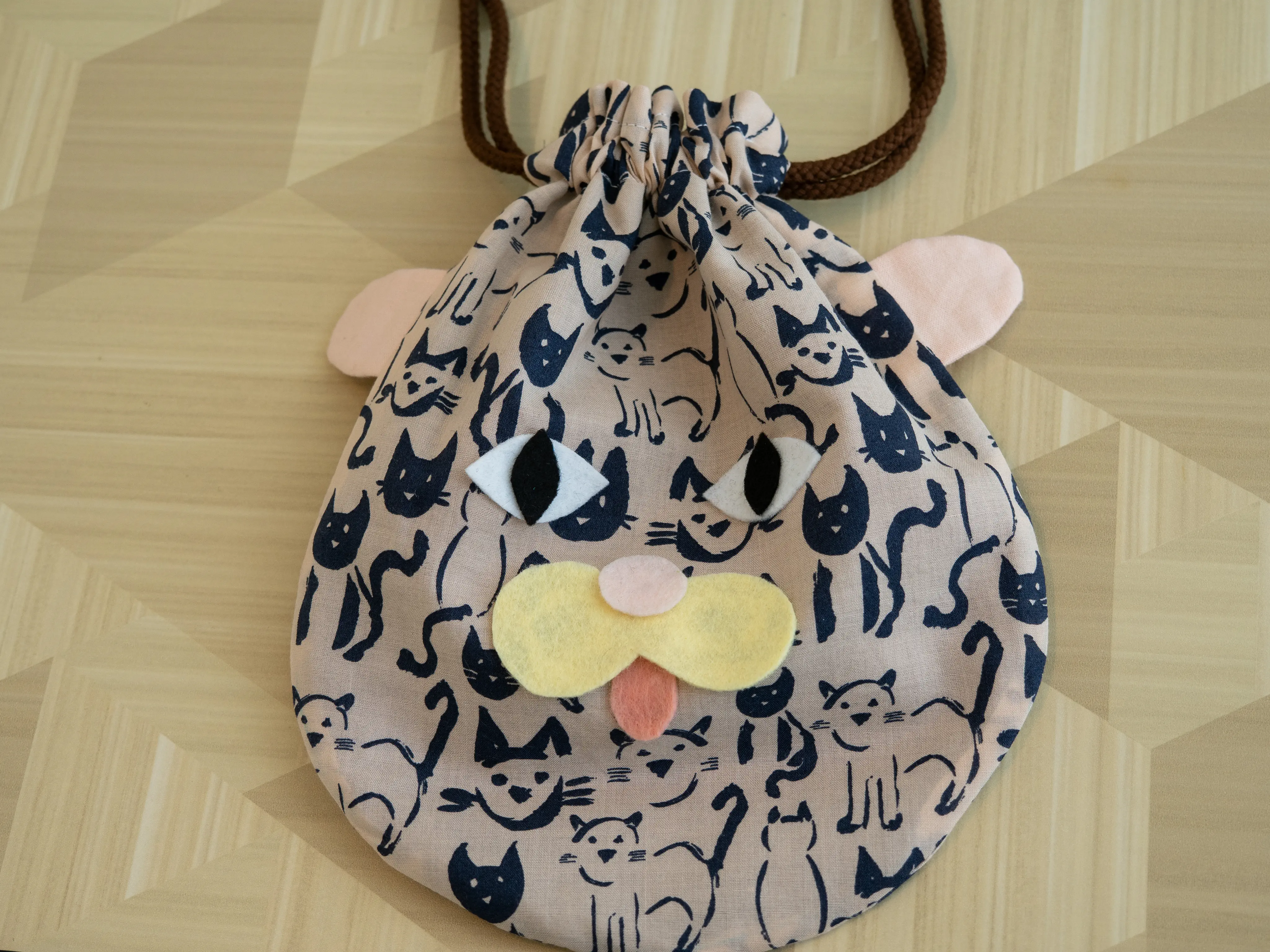 ワークショップで妻が作っていた、変な顔の猫の袋。かわいくできたね。