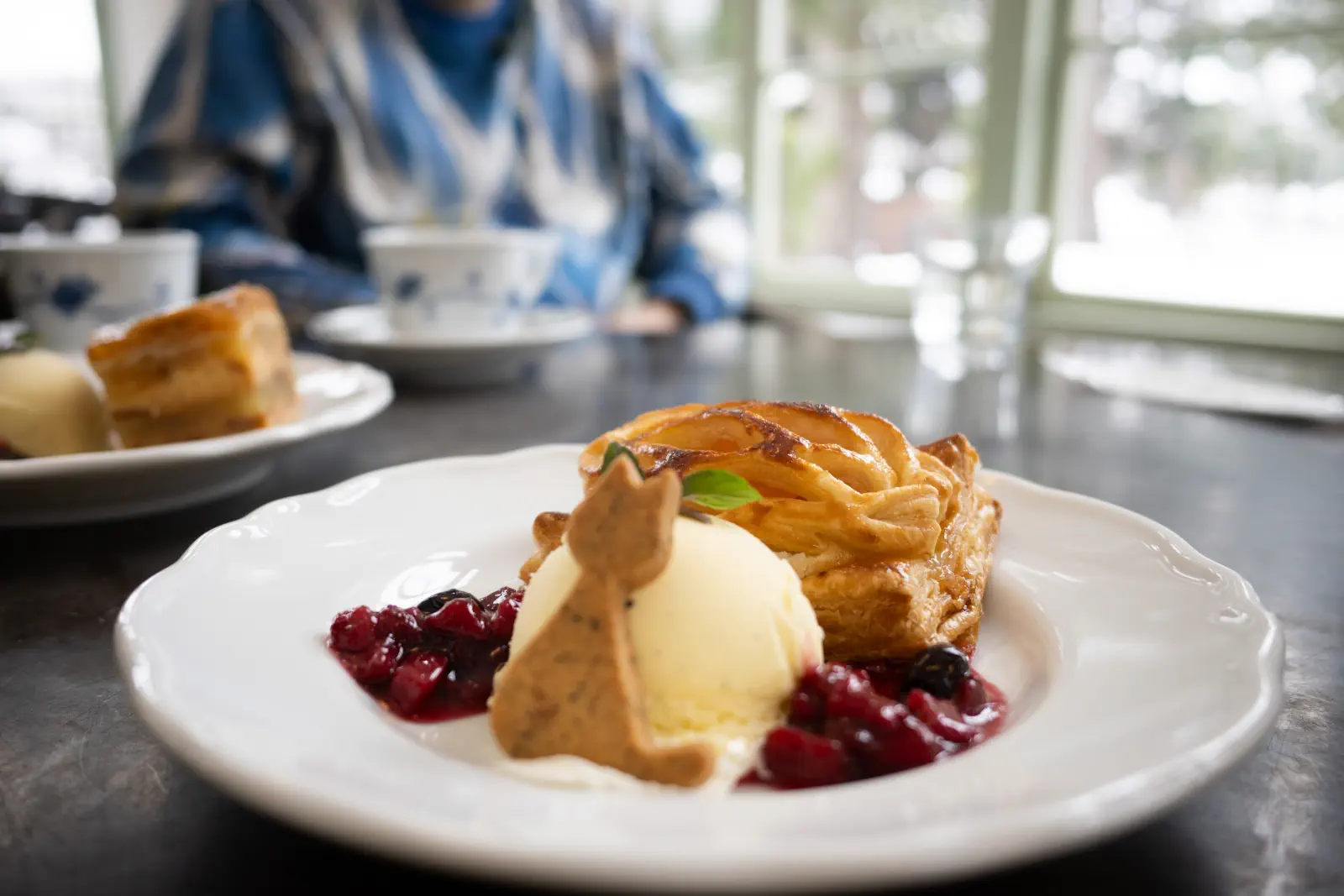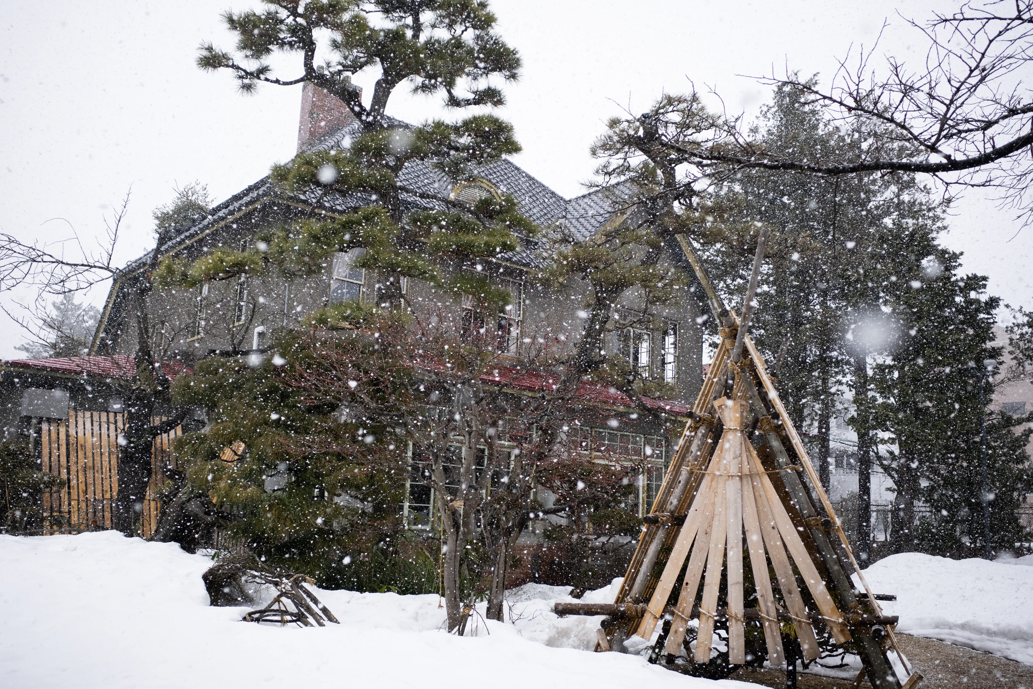 雪が結構降ってきた中、弘前城前の洋館で雪積もる庭園が眺められる席でアップルパイ。弘前はアップルパイが有名らしい。