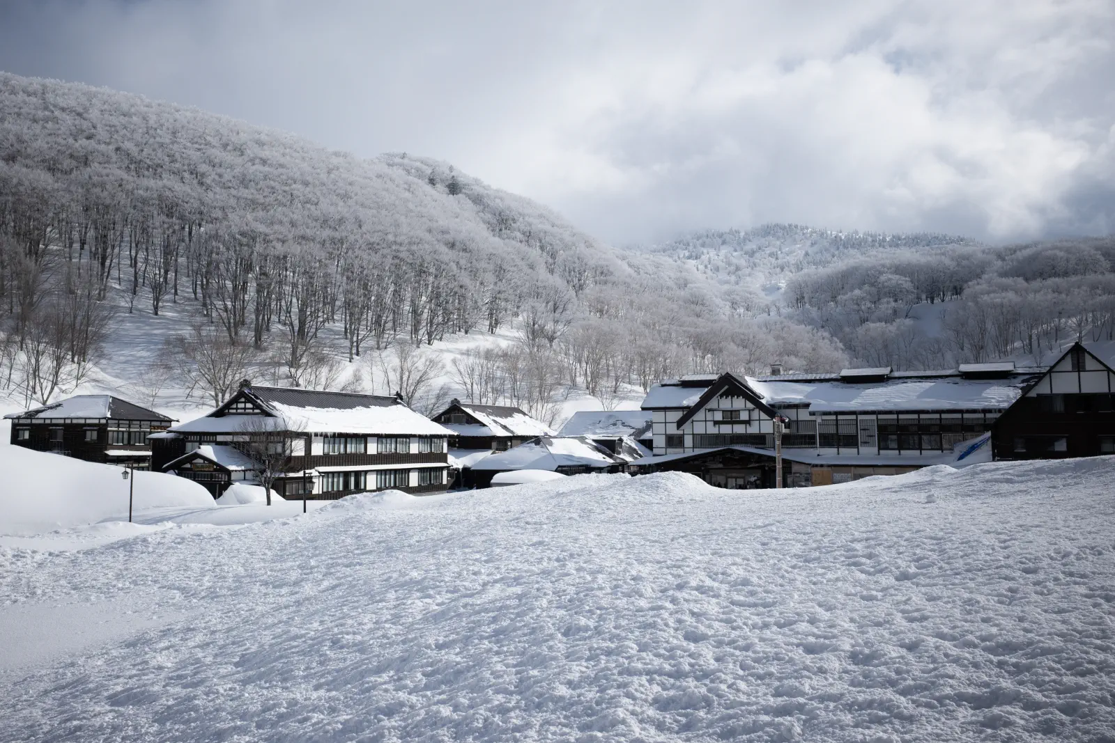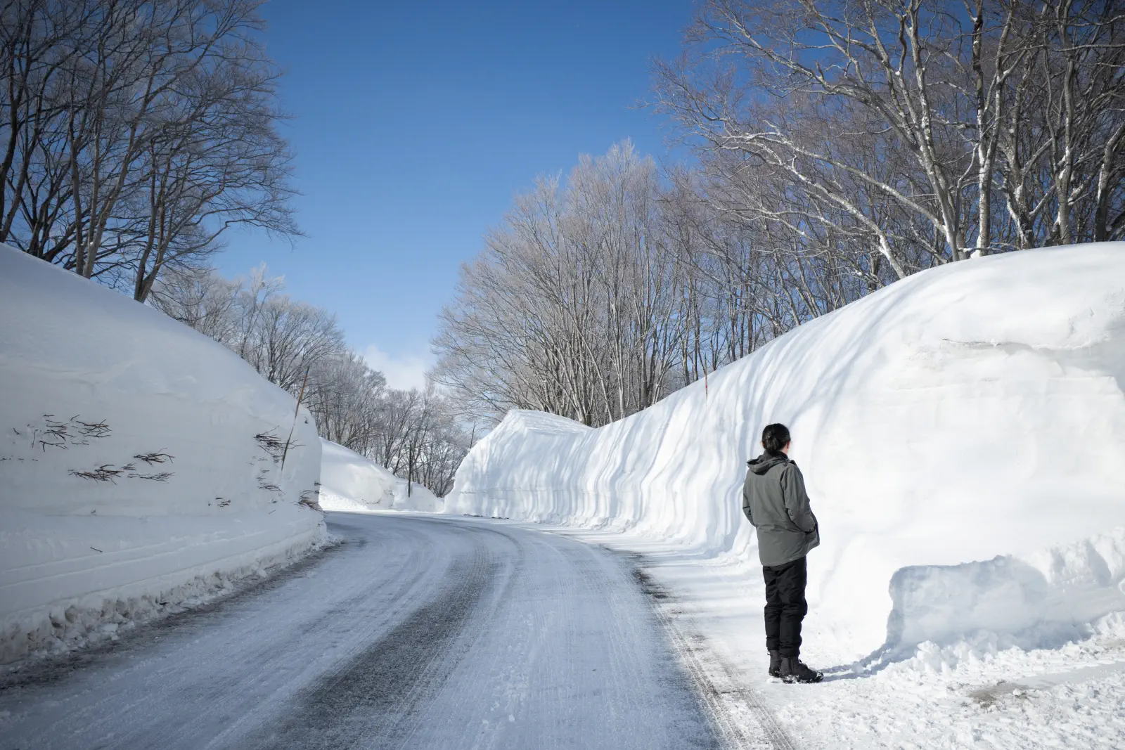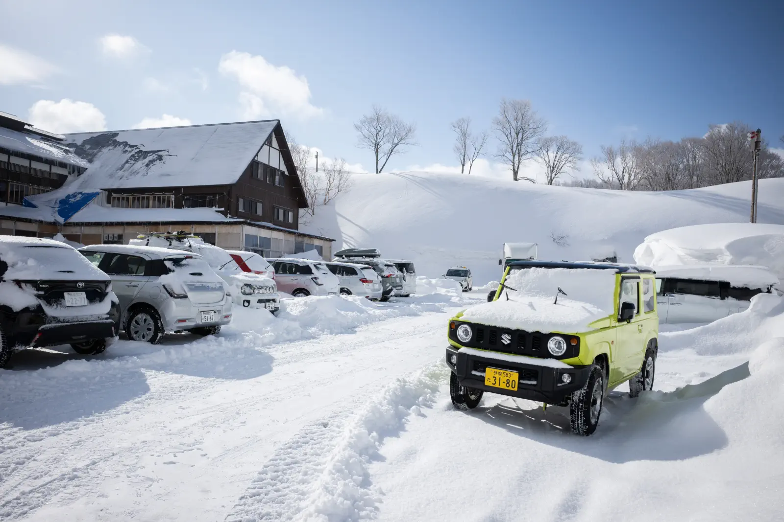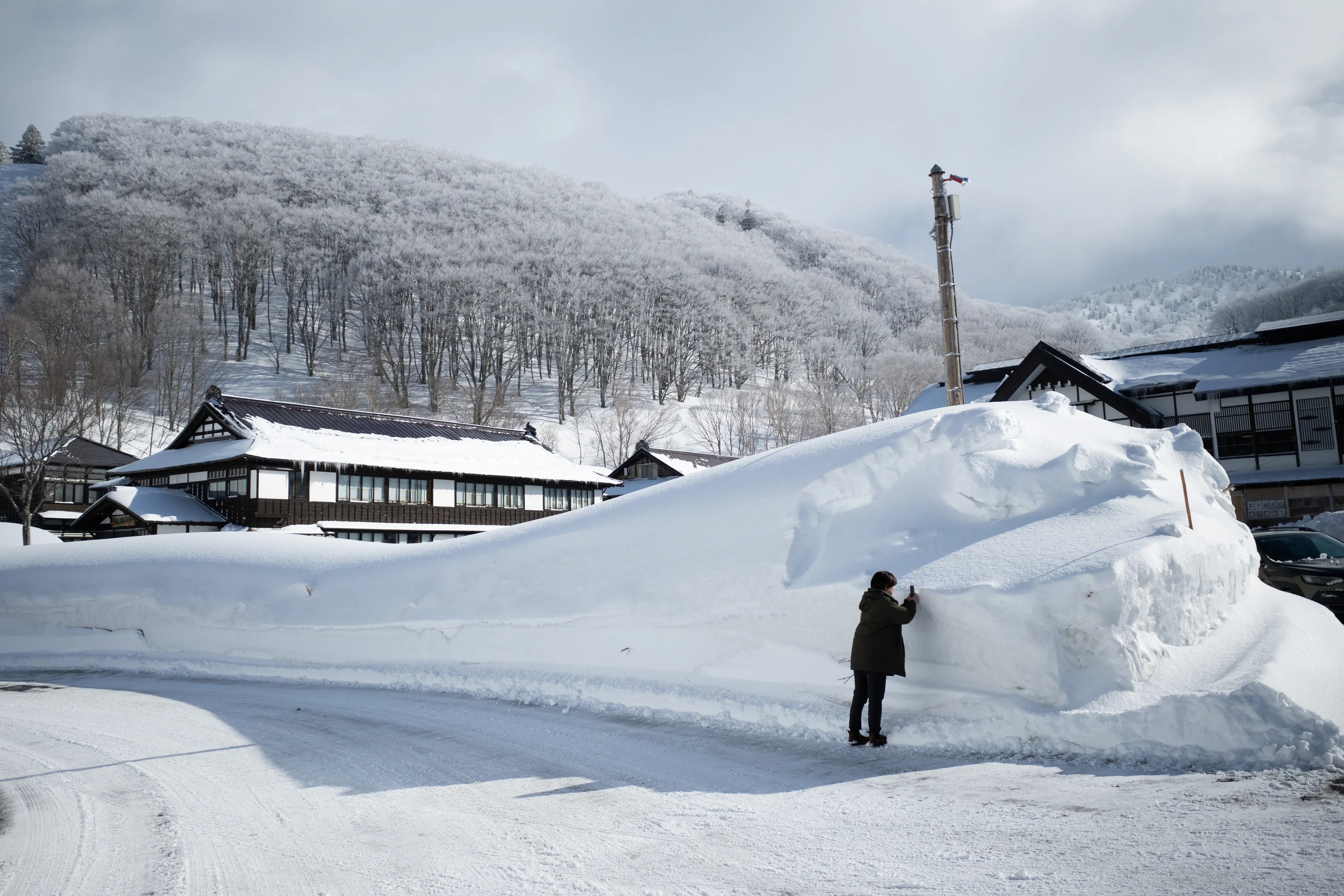 深い雪道を安全運転しながら(この日はだいたい運転担当)、酸ヶ湯温泉旅館へ。2013年、アメダスの積雪量が566cmという記録を持っている、大変雪深い場所にある。写真は翌朝のものだが雪深い。